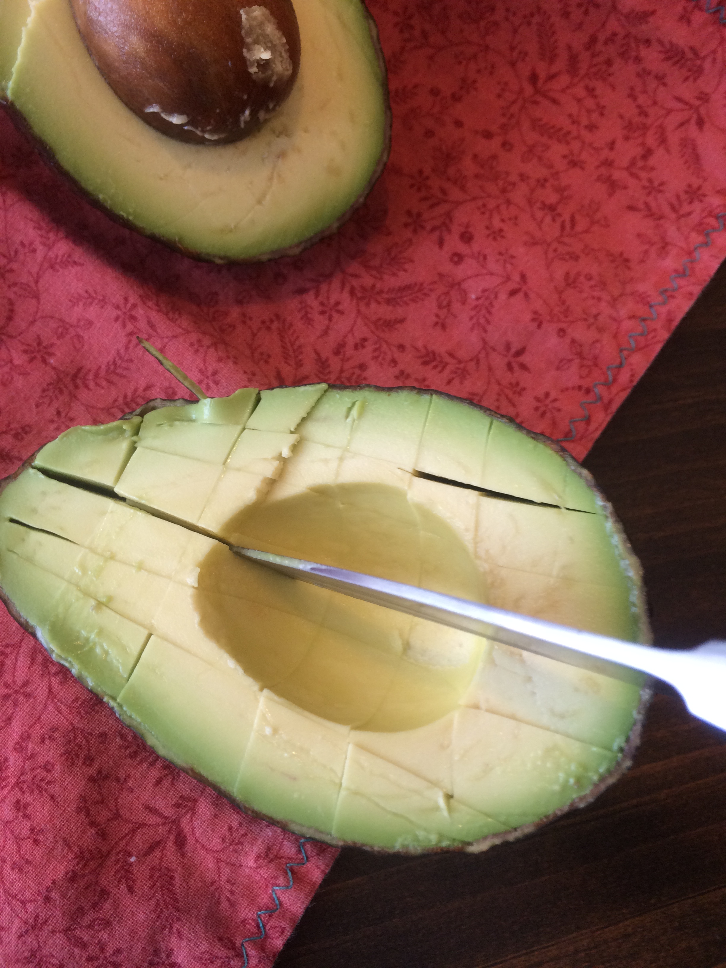 Start by running your knife around the avocado and twisting to separate the halves. Remove the pit by spearing with your knife and twisting to release. Then cube the avocado, like so: