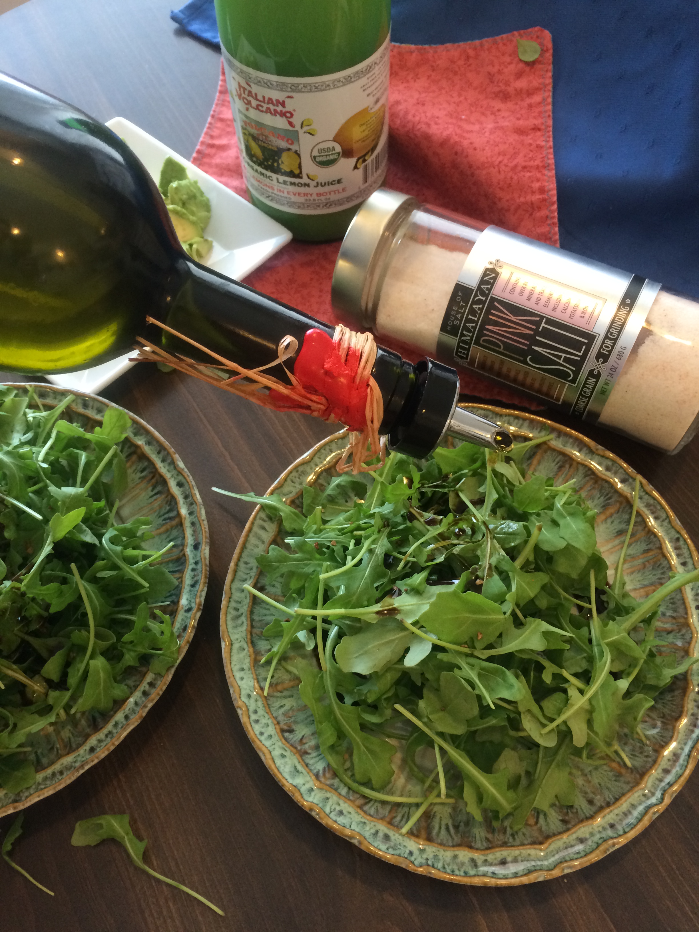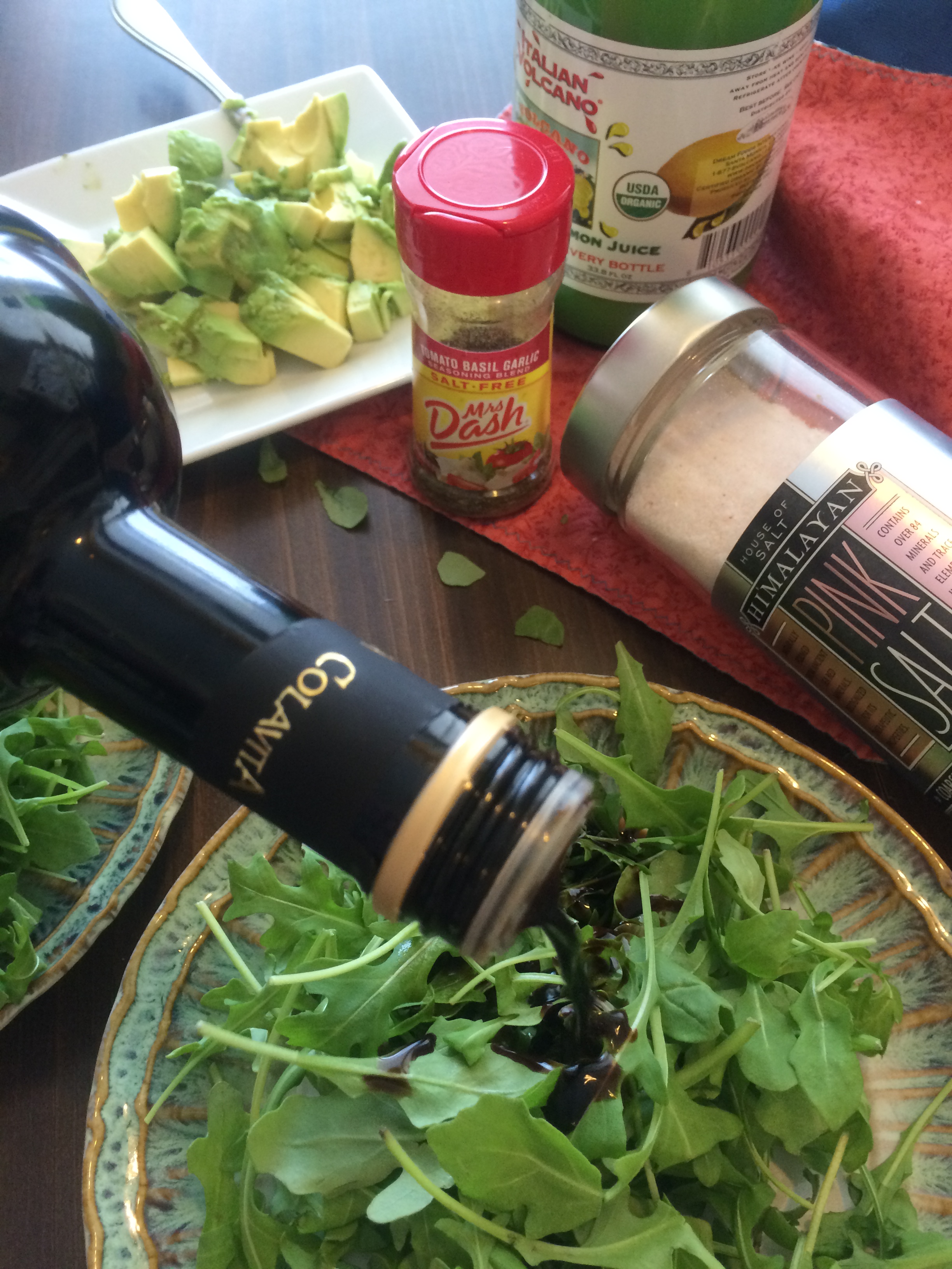 Cutting the avocado is probably the most complex part of the whole recipe. Now all you do is pile a couple generous handfuls of arugula on a pair of salad plates. Then you drizzle lightly with balsamic vinegar and olive oil.